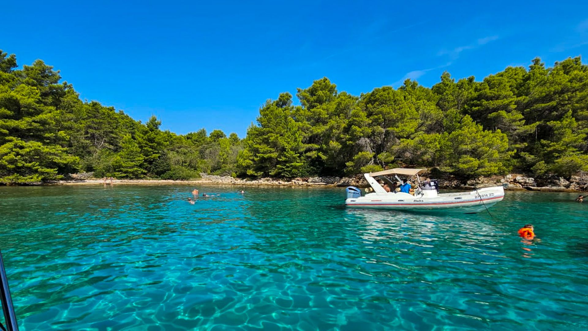 Nach unserem Besuch in Preko fahren wir entlang der atemberaubenden Küste von Ugljan und entdecken wunderschöne Buchten, die sich ideal zum Schwimmen und Schnorcheln eignen. Wir machen einen Halt für ein erfrischendes Bad in Uvala Frnaza, bekannt für sein kristallklares, türkisfarbenes Wasser, bevor es weitergeht nach Ugljan, einem charmanten Touristen- und Fischmarkt voller Geschichte.